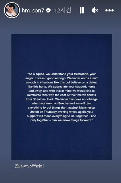 손흥민 또한 이 게시물을 자신의 SNS 계정에 리그램하며 간접적으로 사과의 뜻을 밝혔다.