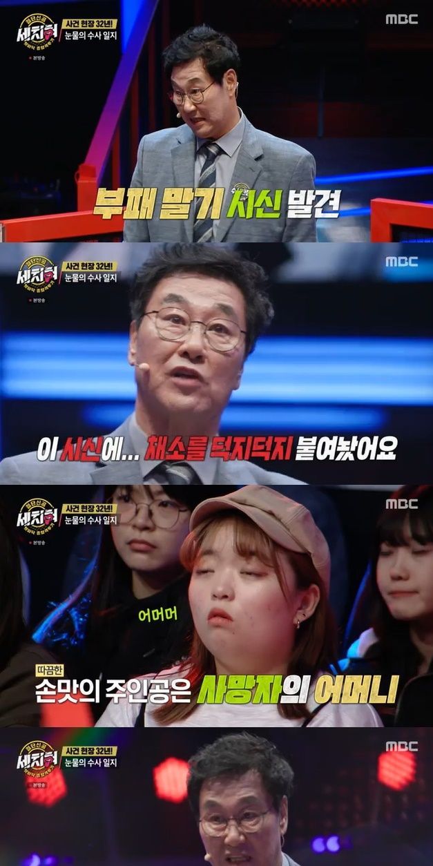 수사 과정에서 그 집에 살던 50대 아들이 사망한 걸 알게 됐다고. 김복준은 "가서 보니까 시신이 부패해서 부패 가스로 눈뜨기 힘들 정도였다"라고 밝혀 충격을 선사했다. 특히 "시신을 살펴보는데 깜짝 놀랐다. 이 시신에 채소를 덕지덕지 붙여 놓은 거다. 가지, 상추 같은 걸 붙여 놓고 그 위에 얇은 솜도 깔아 뒀더라"라고 전해 충격을 더했다.