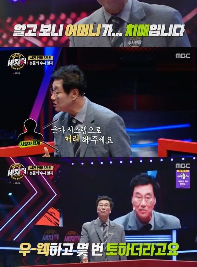 김복준은 "'누가 이랬지?' 생각하는데 갑자기 눈앞이 번쩍했다. 누가 와서 제 뺨을 때렸는데 사망한 분의 어머니였다. 알고 보니 어머니가 치매였다"라면서 "연탄불로 방을 따뜻하게 해놓았는데 그 이유도 자식이 아프니까 계속 따뜻하라고 해놓은 거였다. 그래서 부패가 더 빨리 진행됐던 것"이라고 설명했다.
