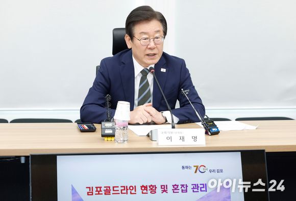 이재명 더불어민주당 대표가 지난 25일 오전 서울 강서구 한국공항공사에서 열린 '김포골드라인 현황 청취 간담회'에서 인사말을 하고 있다. [사진=국회사진취재단]