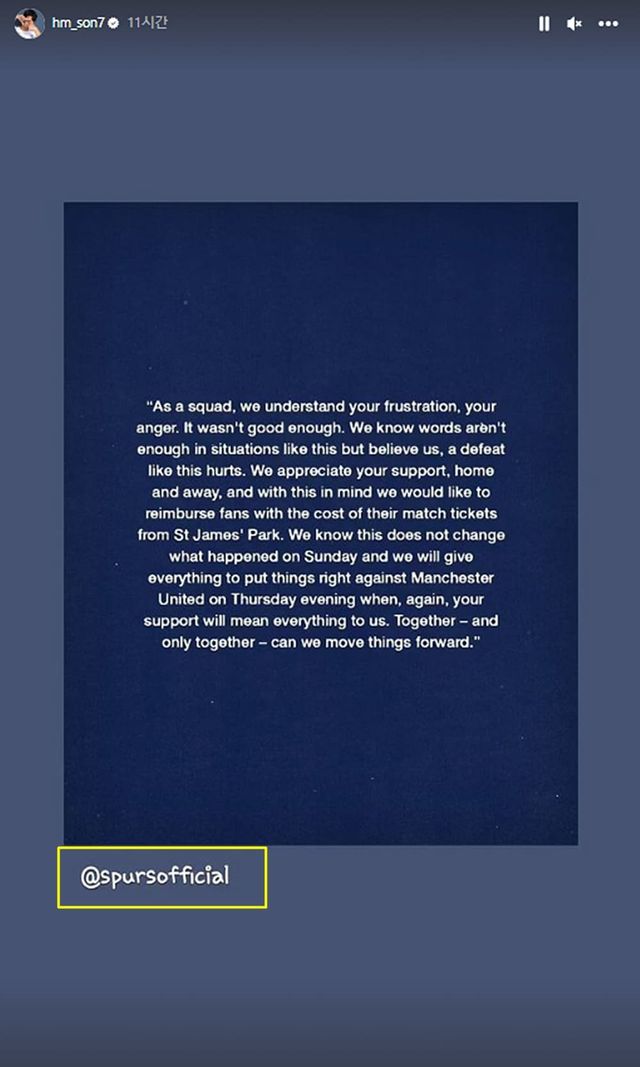이에 손흥민, 해리 케인 등을 비롯한 여러 토트넘 소속 선수들도 해당 공지를 개인 인스타그램 스토리로 공유하며 소식을 알렸다.