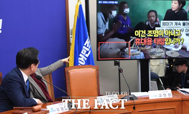 장경태 최고위원은 이날 회의에서 김건희 여사의 캄보디아 환아 위문 사진에 조명이 사용됐다고 주장해 허위사실 유포 혐의로 검찰에 송치된 것과 관련해 영상을 공개하며 조명 설치 의혹을 재차 제기했다.