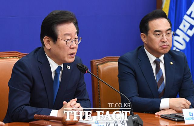 [더팩트ㅣ국회=이새롬 기자] 이재명 더불어민주당 대표가 26일 서울 여의도 국회에서 열린 최고위원회의에 참석해 김건희 여사의 캄보디아 환아 위문 관련 영상을 살펴보고 있다.