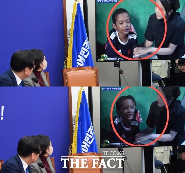 이 대표와 고민정 최고위원이 김 여사의 캄보디아 환아 위문 관련 영상을 살펴보며 대화하고 있다.