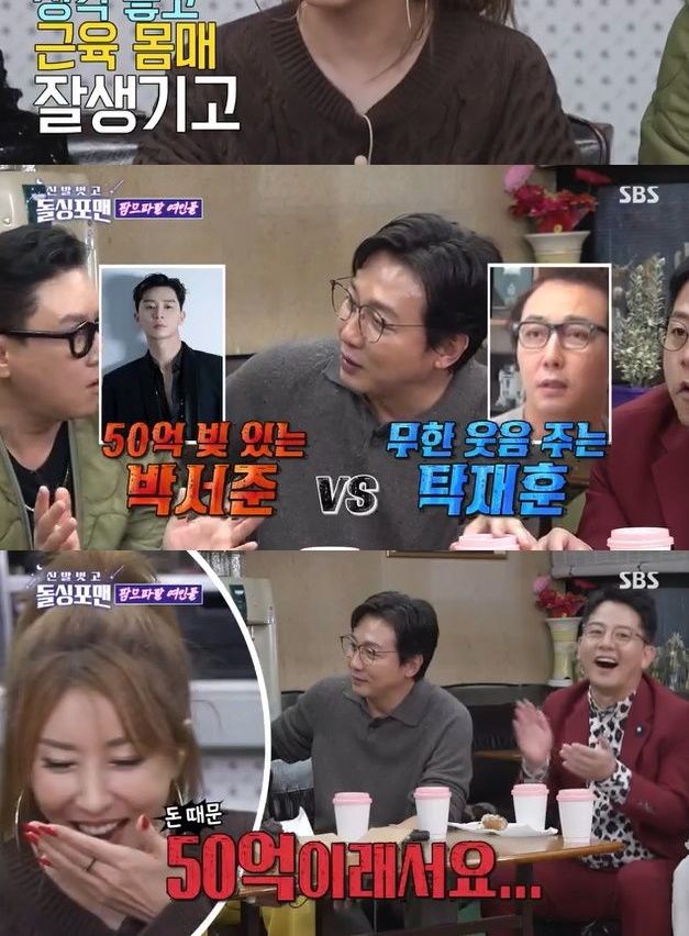 출연진들은 김완선에게 다소 난감한 질문을 던졌다. '50억 빚 있는 박서준 vs 무한 웃음 주는 탁재훈' 중에서 누구를 택하겠냐는 것. 김완선은 잠시 고민하더니 "탁재훈"이라고 말했다. 탁재훈이 기뻐했고, 김준호는 "외모를 안 보는 것 같다"라며 놀라워했다.