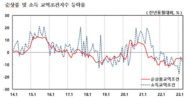 교역조건 지수는 통관 기준으로 작성되는데 수출 가격이 11.3% 하락해 수입가격이 6.6% 하락한 것 대비 더 큰 폭이 떨어졌다.