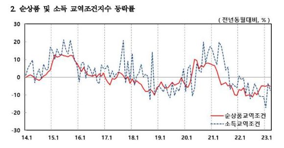 26일 한국은행이 발표한 '2023년 3월 무역지수 및 교역조건(요약)'에 따르면 3월 순상품교역조건지수는 83.01로 전년 동기 대비 5.1% 하락했다. 이는 지난해 7월(82.71) 8개월 이후 최저치다. 낙폭도 지난 2월 하락 폭(-4.7%) 보다 벌어졌다.