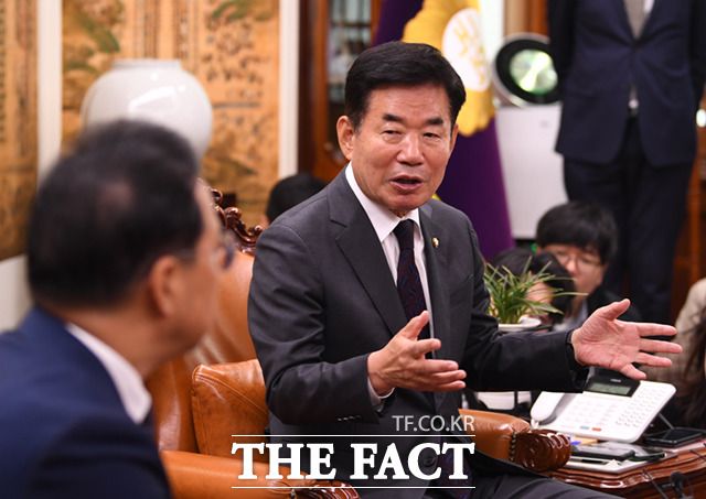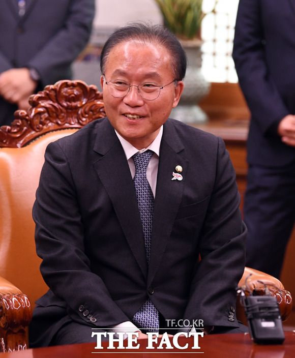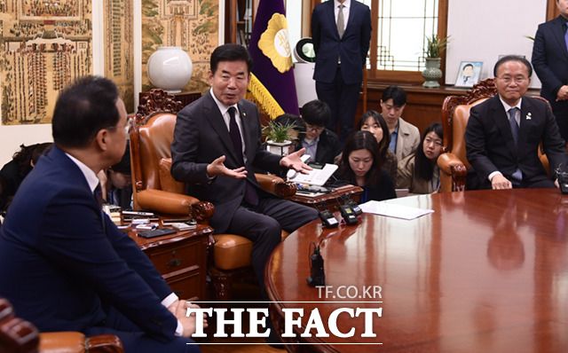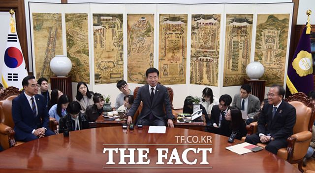 [더팩트ㅣ국회=이새롬 기자] 김진표 국회의장이 26일 서울 여의도 국회에서 열린 국회의장 주재 교섭단체 원내대표 회동에서 윤재옥 국민의힘 원내대표, 박홍근 더불어민주당 원내대표와 기념촬영하고 있다.
