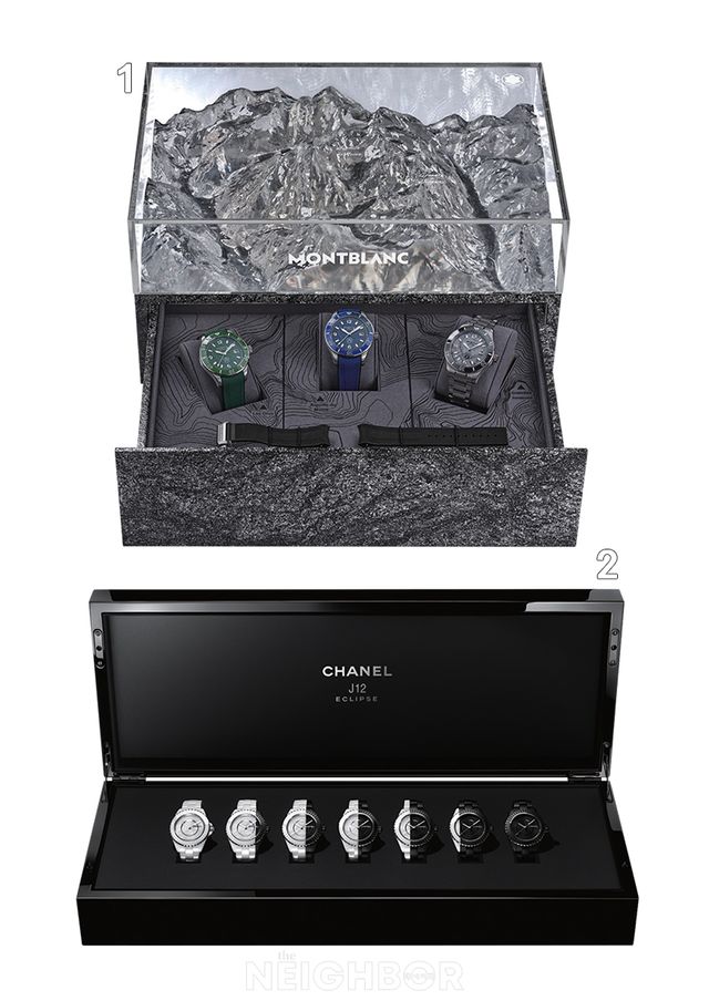율리스 나르덴은 3명의 천문학자에 대한 존경의 뜻을 담아 1988년부터 출시한 텔루륨 요하네스 케플러, 아스트로라븀 갈릴레오 갈릴레이, 플래니타리움 코페르니쿠스를 합쳐 2010년 ‘트릴로지 오브 타임’이라는 이름의 세트로 새롭게 구성해 100개 한정 생산했는데, 지금도 소더비나 크리스티에서 세트로 경매에 나온다. 그 외에 온리 워치 경매에는 샤넬이나 몇몇 브랜드에서 세트 구성으로 단 하나뿐인 제품을 내놓는다. 2021년 까르띠에는 3가지 미스터리 아워 방식의 로통드 드 까르띠에 시계를 모은 ‘아이콘즈’ 세트를 판매한 적이 있다. 이렇게 수집욕을 불러일으키는 세트가 올해도 어김없이 나왔다. 샤넬은 흰색에서 검은색으로 변하는 7개의 J12 시계를 모은 ‘이클립스 박스’ 세트를 내놨고, 몽블랑은 초록색, 회색, 파란색 다이얼의 1858 아이스드 씨 오토매틱 데이트 시계를 모은 ‘고프레’ 세트를 한정판으로 내놨다. 몽블랑이 메르 드 글라스 빙하가 있는 1913m 높이의 산에서 착안해 191개만 한정 생산하는 세트는 시계보다 3D 프린터로 산봉우리를 재현한 특별한 상자에 담겨 제공된다. 파르미지아니도 중국력, 이슬람력, 그레고리안력을 기준으로 다이얼을 구성한 3가지 퍼페추얼 캘린더를 모아 ‘컬처럴 캘린더스 트릴로지’ 세트를 소개했다.