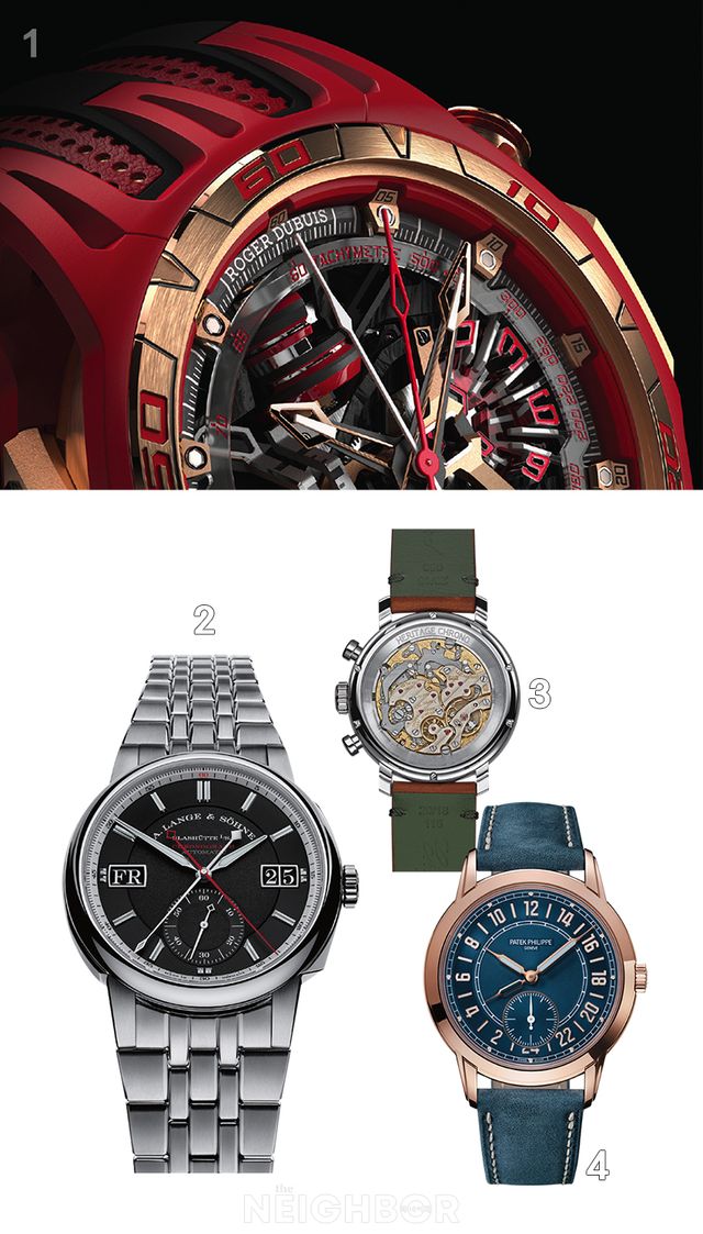 1 원통형 터보로터를 둔 로저드뷔 모노볼텍스™ 스플릿 세컨즈 크로노그래프. 2 랑에 운트 죄네 오디세우스 크로노그래프. 3 1963 헤리티지 크로노그래프. 4 파텍 필립 칼라트라바 5224R 트래블 타임.