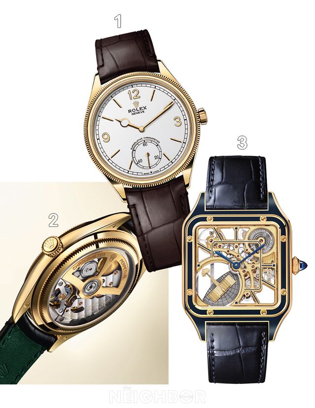 1, 2 1908 시계에 탑재한 칼리버 7140. 3 까르띠에 산토스 스켈레톤.