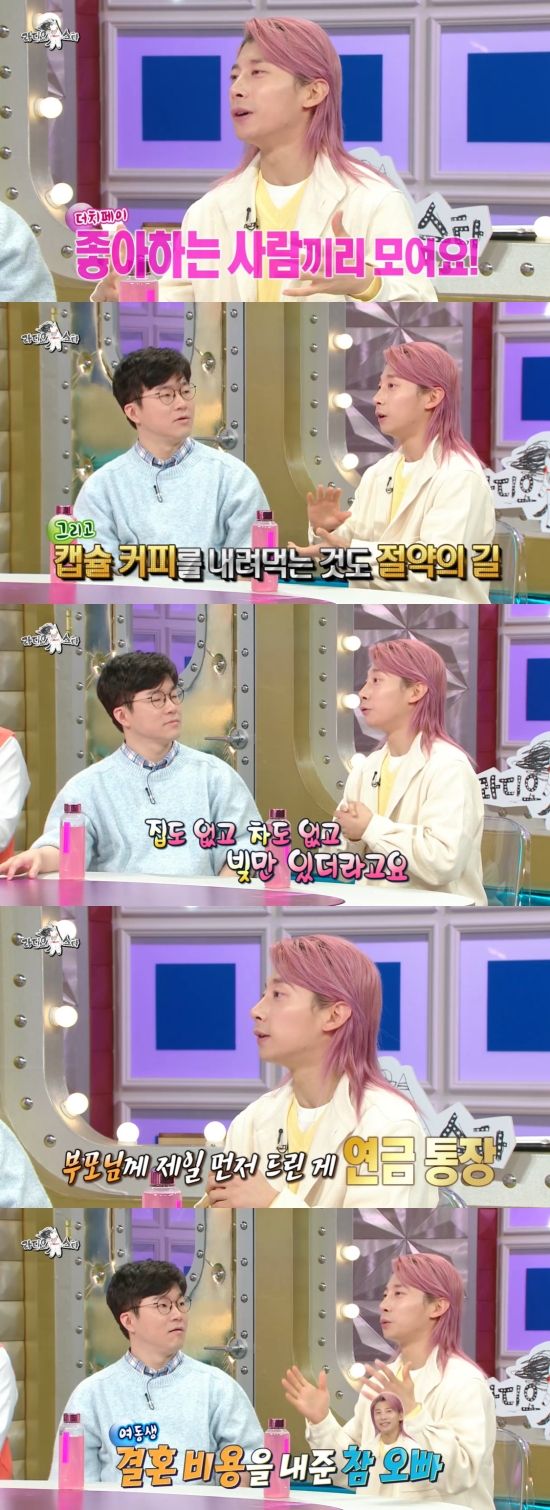 이어 그는 검소한 철학으로 커피 소비가 제일 아깝다며 "커피를 최대한 사 먹지 말라고 한다"고 말했다. 더 좋은 건 캡슐 커피를 내려먹는 게 제일 좋다고 말하면서 "후배들이 커피 머신을 사야 하지 않나. '차라리 내 커피 머신으로 내려 먹어라 다만 내 커피 캡슐을 쓸 때 500원씩 주라'고 했다"고 에피소드를 전했다.