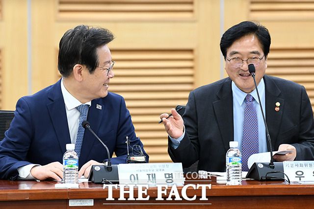 이 대표(왼쪽) 발언 경청하는 우 의원.
