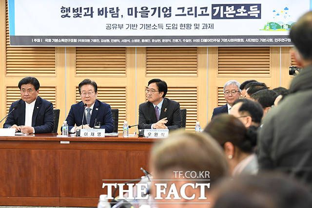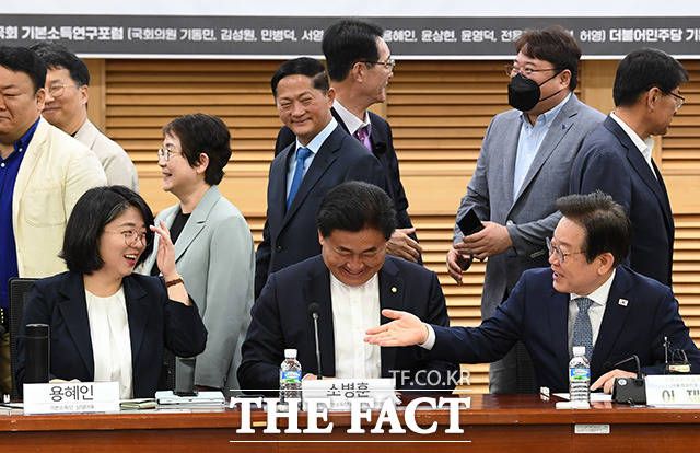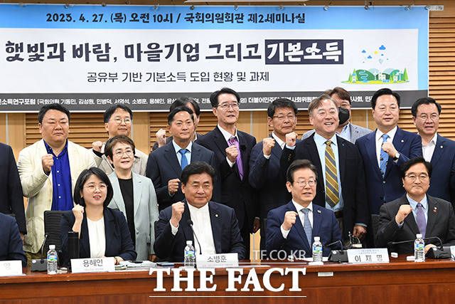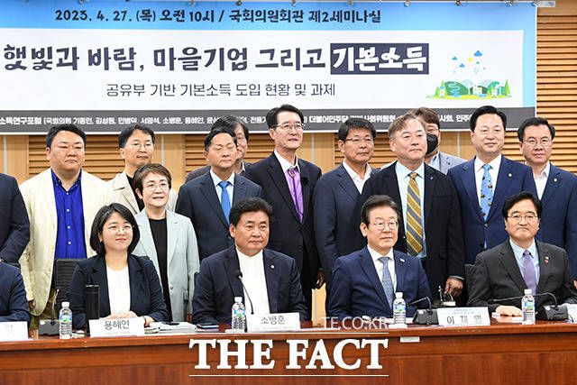 [더팩트ㅣ국회=남용희 기자] 용혜인 기본소득당 상임대표와 소병훈 국회 기본소득연구포럼 대표의원, 이재명 더불어민주당 대표, 우원식 더불어민주당 의원(앞줄 왼쪽부터) 및 참가자들이 27일 오전 서울 여의도 국회 의원회관에서 열린 '햇빛과 바람, 마을기업, 그리고 기본소득 토론회'에 참석해 기념촬영을 하고 있다.