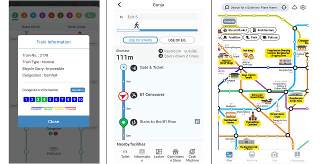 The location-based app can recognize users' location and informs them which side of the train they should take. It also guides passengers on various facilities in stations such as bathrooms and exits. Users can also find out a subway train’s congestion level by compartment.