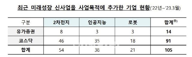 최근 국내 증시에서 2차전지와 인공지능(AI), 로봇 관련주들을 둘러싸고 투자 열풍이 불면서 급등했다. 이에 따라 105개 상장사가 1년 사이 사업 목적에 미래성장 신사업을 추가한 것으로 나타났다. 금감원에 따르면 지난해부터 올해 3월까지 사업 목적에 2차 전지를 추가한 기업은 총 54개 기업이고, AI는 38개 기업, 로봇은 21개 기업 등 총 105개 기업인 것으로 드러났다.
