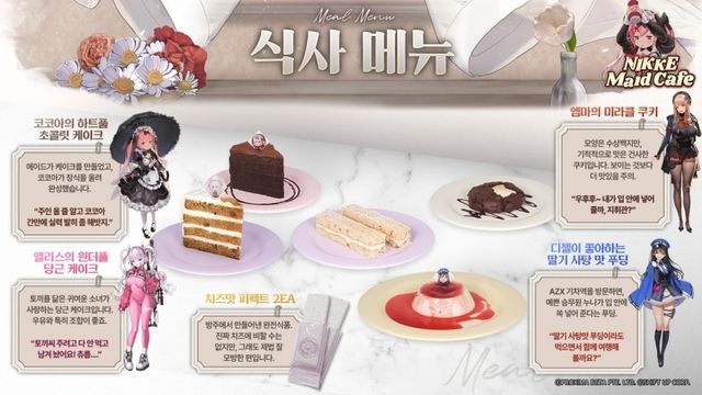 준비된 메뉴는 △코코아의 하트풀 초콜릿 케이크 △앨리스의 원더풀 당근 케이크 △치즈맛 퍼펙트 △엠마의 미라클 쿠키 △디젤이 좋아하는 딸기 사탕맛 푸딩 △메이드 포 유의 바니바니 오므라이스 등이다.