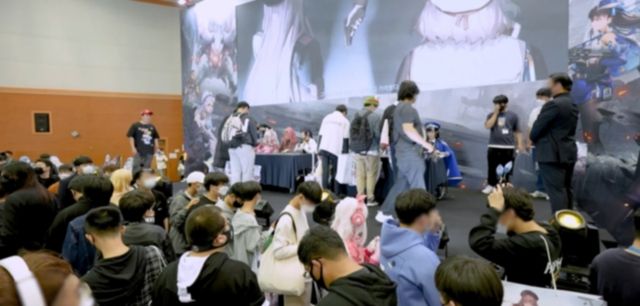 지난해 11월 부산 벡스코에서 열린 'G-STAR 2022' 행사에 참여한 '승리의 여신: 니케'. 사람들의 관심이 집중된 모습 / 이하 유튜브 '승리의 여신: 니케-신규 업데이트'