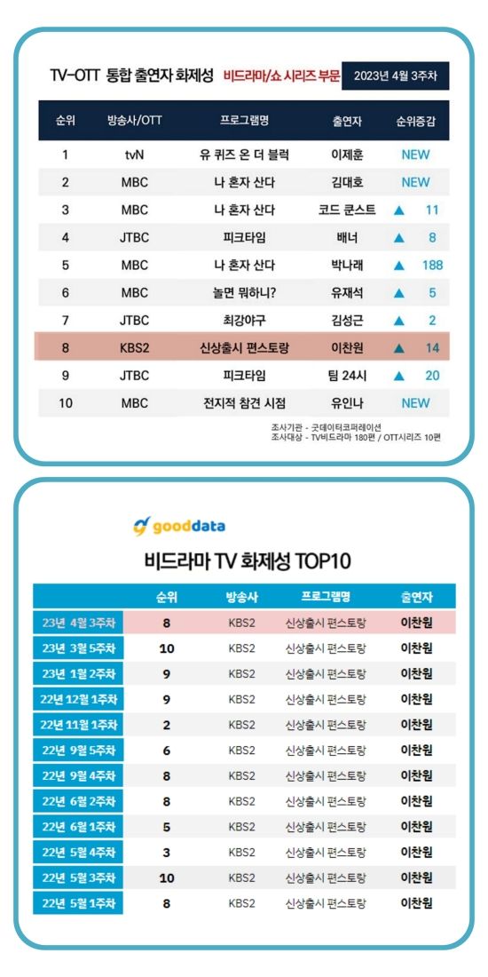 최근 굿데이터코퍼레이션 발표에 따르면, 이찬원은 4월 3주 차 TV-OTT 통합 출연자 화제성 비드라마/ 쇼 시리즈 부문 TOP8에 이름을 올렸다.