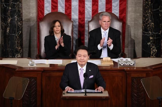 当地时间4月27日,在美国国会大厦,韩国总统尹锡悦(前)在美国参众两院联席会议上发表演讲。后排为美国副总统卡玛拉·哈里斯(左)、众议院主席凯文·麦卡锡。【图片提供 韩联社】