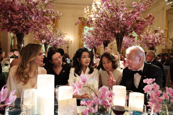 김 여사는 26일(현지시간) 워싱턴DC 백악관에서 바이든 대통령 부부가 주최한 국빈 반찬에 참석했다. 이도운 대통령실 대변인은 김 여사가 배우 졸리와 인권, 아동 입양, 동물권, 환경 보호, 한국과의 인연에 대해 얘기를 나눴다고 전했다.