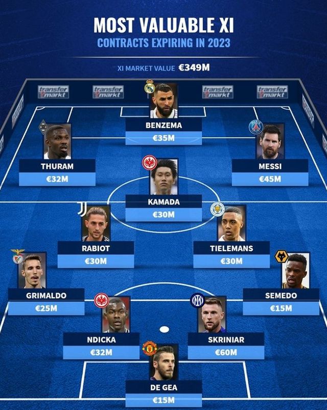 축구 통계 매체 '트랜스퍼마크트'는 '여름 이적시장을 기다릴 수 없다'라는 코멘트와 함께 흥미로운 베스트 일레븐을 공개했다. 소속팀과 계약 만료를 앞둔 선수들로 구성한 라인업이었다. 몸값 총액이 3억 4,900만 유로(약 5,821억 원)에 달할 정도였다.