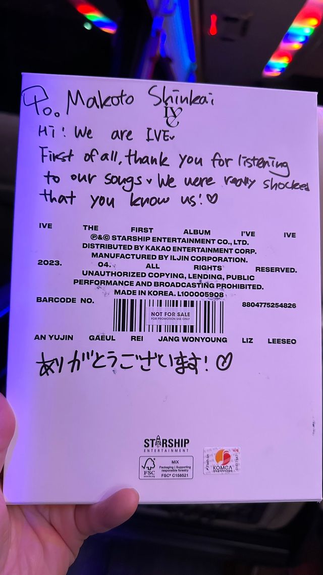 신카이 마코토 감독은 28일 새벽 "한국에서의 취재에서 몇 번이나 아이브를 좋아한다고 말했더니! 세상에! 아이브 멤버들의 사인을 받았다!! 대박!!"이라는 글과 함께 사진을 게재했다.