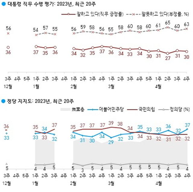 28일 여론조사기관 한국갤럽에 따르면, 이 기관의 4월 4주 정례 여론조사에서 윤 대통령의 직무수행 평가는 '잘 하고 있다'는 긍정 평가가 30%, '잘못하고 있다'는 부정 평가가 63%로 집계됐다.