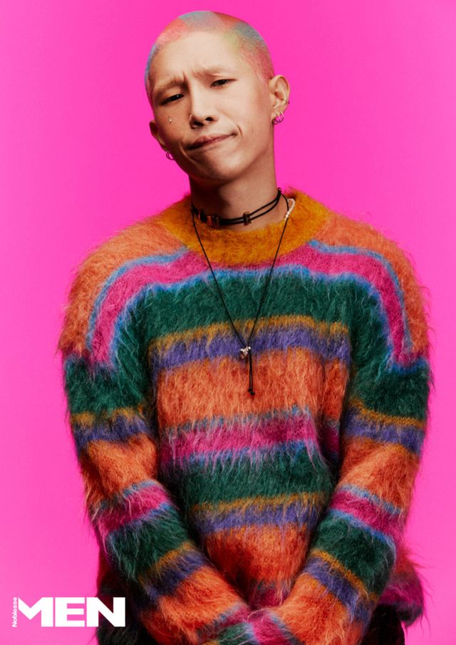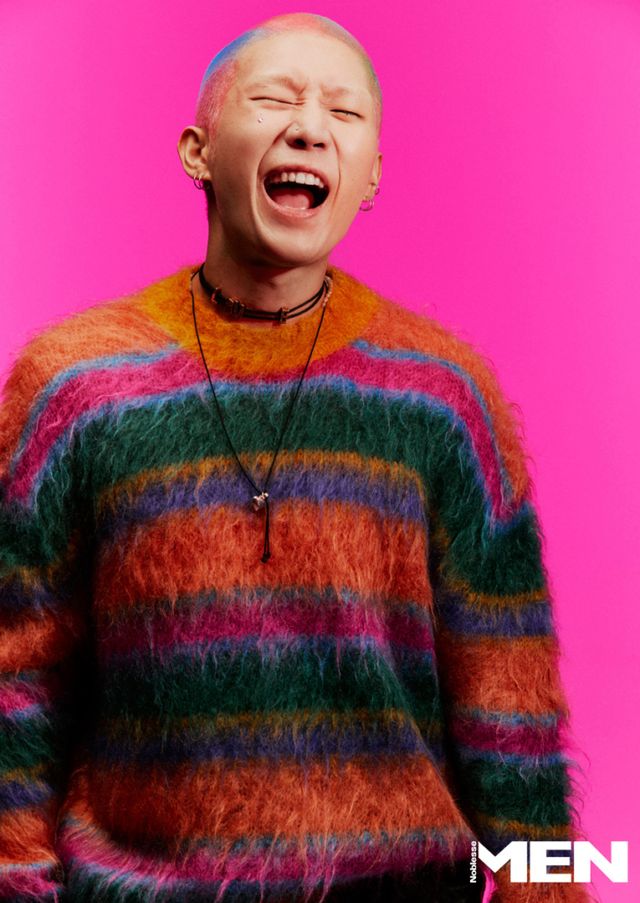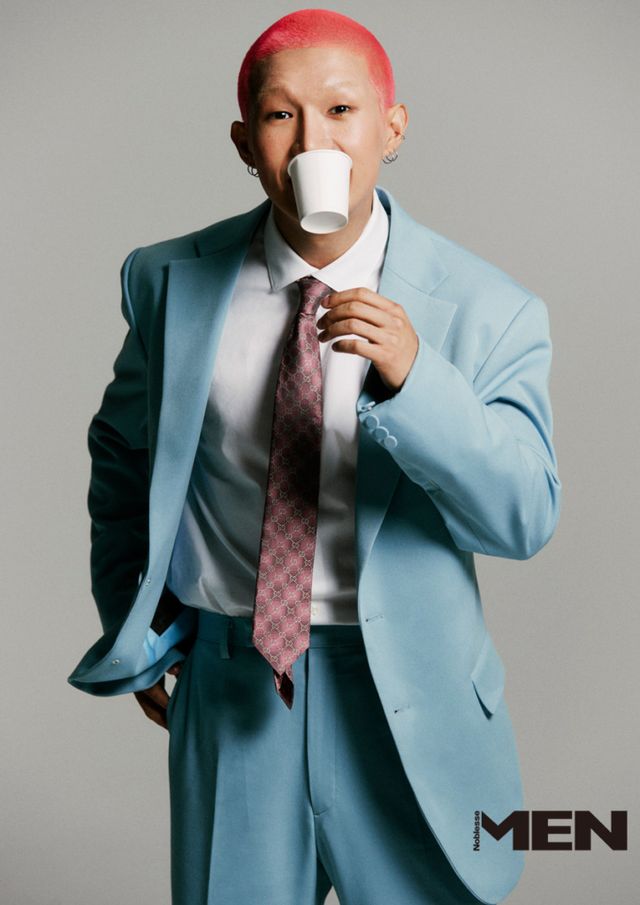 제이보_ 재킷과 팬츠 모두 Lemeteque, 패턴 타이, 블랙 스니커즈 모두 Gucci, 화이트 양말과 화이트 셔츠 모두 스타일리스트 소장품.