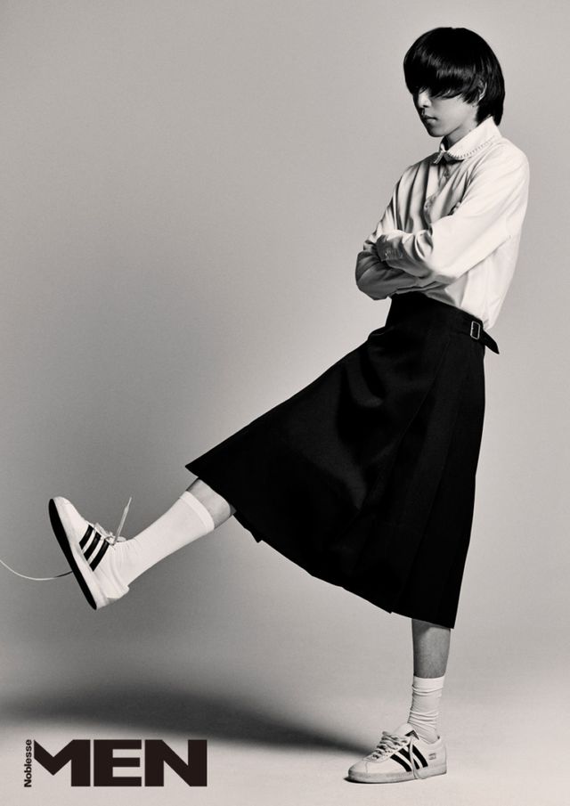 강혁준 _ 셔츠 Simone Rocha by MUI, 스커트 Jil Sander by MUI, 화이트 스니커즈 Adidas, 화이트 양말 스타일리스트 소장품