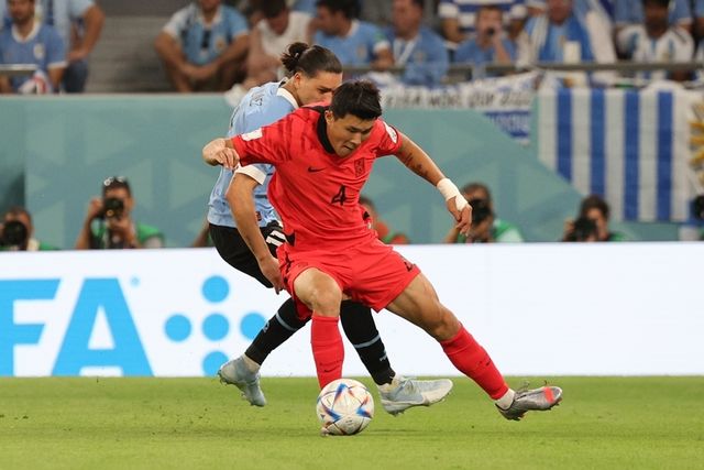 김민재가 지난해 11월 24일(현지 시각) 카타르 알라이얀 에듀케이션 시티 스타디움에서 열린 2022 카타르 월드컵 조별리그 H조 1차전 대한민국과 우루과이의 경기에서 볼 다툼을 하고 있다.