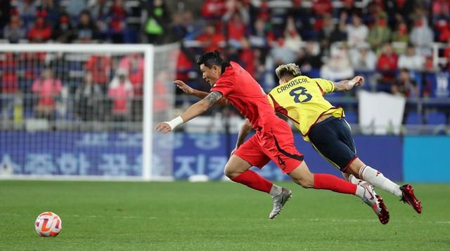 김민재가 지난달 24일에 울산 문수 축구경기장에서 열린 축구 국가대표 평가전 대한민국과 콜롬비아의 경기 전반전에서 콜롬비아의 공격을 저지하고 있다.