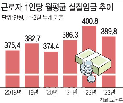 고용노동부의 3월 사업체 노동력 조사에 따르면 올 1~2월 근로자 1인당 실질임금은 389만8000원으로 전년동월대비 11만원 줄었다. 실질임금은 명목임금을 소비자물가지수로 나눠 백분율로 환산한다. 즉 물가상승률을 고려한 임금의 실질적인 가치를 말한다.