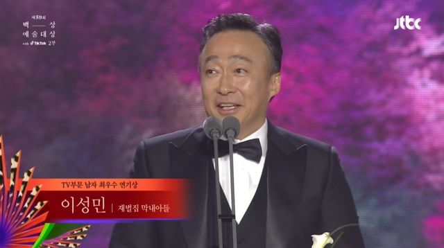 이날 이성민은 TV 부문 남자 최우수 연기상의 영광을 안았다. 그는 JTBC 드라마 '재벌집 막내아들'에서 진양철 회장을 열연해 깊은 인상을 남겼다.
