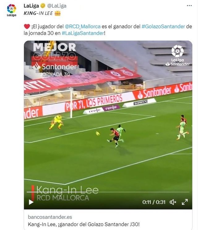 라리가 사무국은 28일(이하 한국시간) 공식 채널을 통해 “KING-IN LEE”라면서 “이강인이 라리가 30라운드 베스트 골에 선정됐다”라고 발표했다. 또한, 영어 계정은 “잡을 수 있으면 잡아 봐라”라며 “이강인이 라리가 30라운드에서 멋진 단독 질주골을 통해 베스트 골을 차지했다”라고 작성했다.