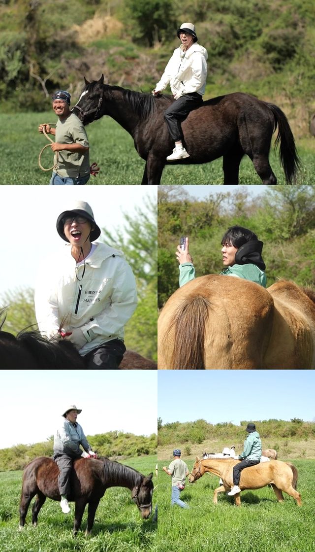 이런 가운데 구조센터 대표님은 네 사람에게 즉석에서 승마를 권유한다. 짝꿍 말 로렌의 등에 올라탄 주우재는 “나 전생에 장군이었나 봐”라며 즐거워한다. 말들과 남다른 교감을 보여줬던 정준하도 짝꿍 말 존 스노우의 등에 묵직하게 올라타 자유를 만끽한다.