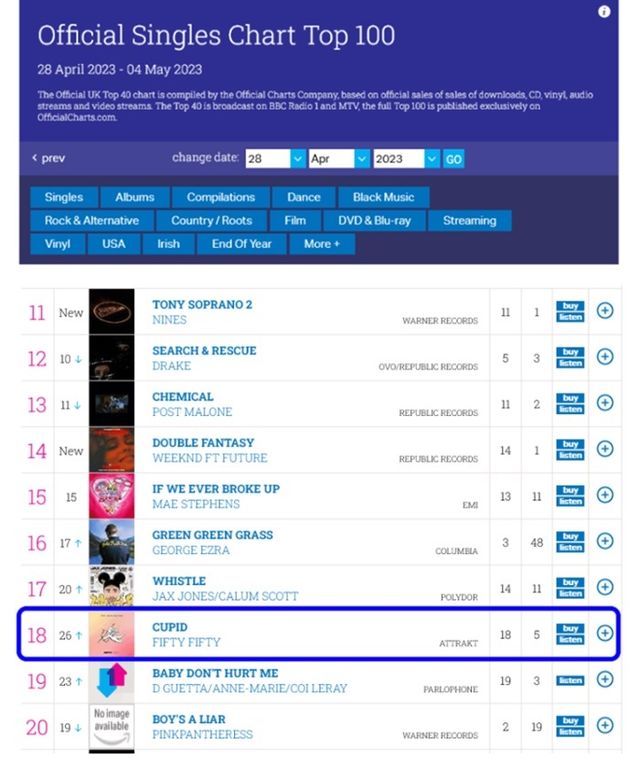 29일(현지시간) 발표된 영국 ‘오피셜 싱글차트 톱 100’에 피프티 피프티(FIFTY FIFTY)의 ‘CUPID‘가 18위에 올랐다. SINGLE TOP 100’은 빌보드의 ‘HOT 100’에 해당하는 영국의 권위 있는 차트로, 금번 피프티 피프티(FIFTY FIFTY)가 기록한 18위는 케이팝 걸그룹곡이 오른 최고 순위(솔로곡 기준)다.