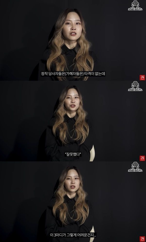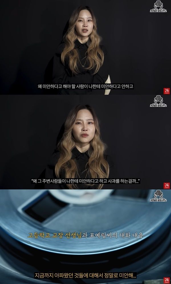 학교장 사과에 표예림 씨는 "왜 정작 사과해야 할 사람은 미안하다고 하지 않고 다른 주변인들이 이 일로 미안하다고 사과하는지 모르겠다"며 "가해자들은 타격이 없는데 왜 주변 사람들만 힘드냐. 미안하다, 잘못했다, 내가 어떻게 해 줄까, 이 세 마디가 그렇게 어렵냐"며 눈물을 보였다.