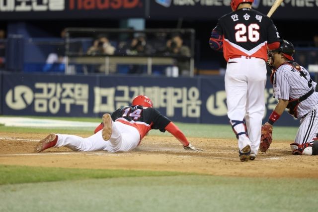 그런데 이때 3루에 있던 대주자 김규성이 기습적으로 홈으로 쇄도, 홈스틸에 성공했다. 급하게 함덕주가 홈으로 공을 던졌으나 공이 빠졌고 그 사이 다른 주자들도 한 베이스 씩을 더 진루했다. 공식 기록은 삼중 도루. KBO리그에서 단 7번 밖에 나오지 않은 진기록이다.