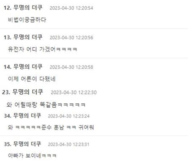누리꾼들은 온라인 커뮤니티 '더쿠'에 "유전자 어디 가겠어", "이제 어른 다 됐네", "비법이 궁금하다", "와 어릴 때랑 똑같다", "훈남이다. 귀여워", "아빠가 보인다" 등 뜨거운 반응을 보였다.