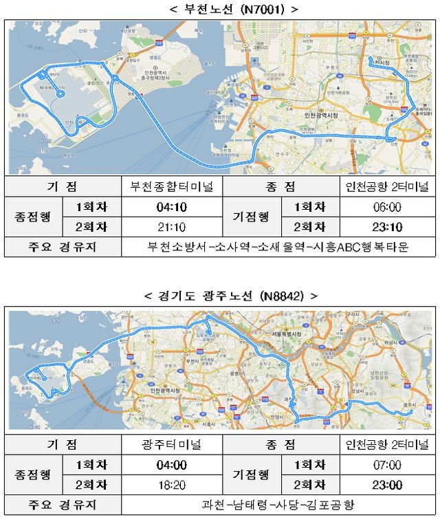 운행을 시작하는 부천 노선은 부천터미널에서 새벽 4시10분에 출발해 소사역 등을 경유한다. 광주 노선은 경기도 광주터미널에서 새벽 4시에 출발해 과천을 경유해 공항에 도착한다.