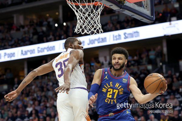 덴버 자말 머레이(오른쪽)가 피닉스 케빈 듀란트를 피해 공 줄 곳을 찾고 있다. 사진=게티이미지코리아.