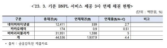 30일 최승재 국민의힘 의원이 금융감독원을 통해 제출받은 자료에 따르면, 네이버파이낸셜·카카오페이·비바리퍼블리카(토스) 등 빅테크 3사의 연체율은 최대 5% 수준에 달했다. 카드사 연체율이 1.5%를 하회하는 점을 고려하면 상당한 격차다.
