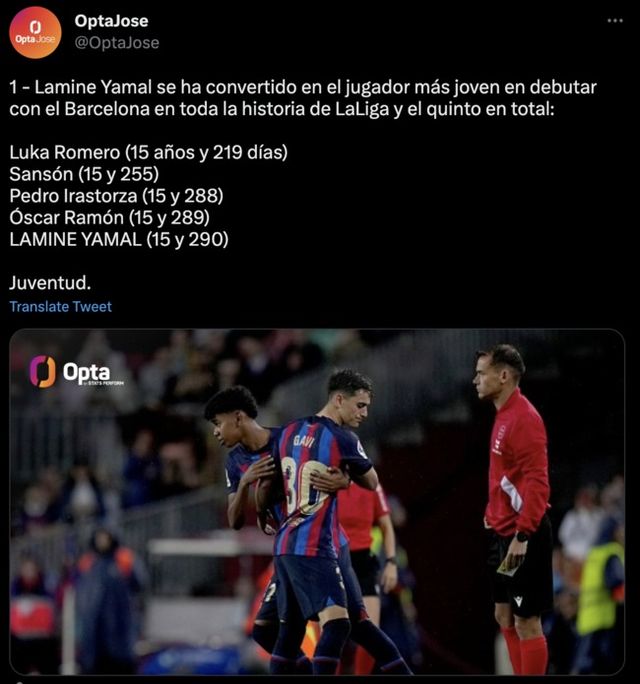 라리가에서도 5번째로 빨랐다. 현재 라리가 최연소 출장 기록은 2020년 당시 마요르카에서 뛰던 루카 로메로(15세 219일)가 보유하고 있다.