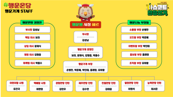 행운만땅 경영진에는 ▲부사장 김성남 단장 ▲책임이사 마스코트 보라 ▲상임이사 문재식 사무국장 ▲재정이사 김형중 팀장(경영기획팀) ▲마케팅이사 박종수 팀장(홍보마케팅)이 참여했다.