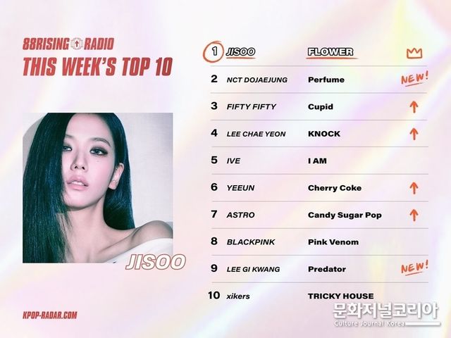 케이팝 전용 차트 프로그램 ‘케이팝레이더’가 케이팝 역사 최초로 미국 라디오 프로그램으로 정규 편성돼 화제를 모으고 있는 가운데, 지난 28일 케이팝레이더 위클리 팬덤 차트가 발표됐다. 이번주 차트에서는 지수의 ‘꽃(FLOWER)’이 3주 연속 1위에 올랐다.