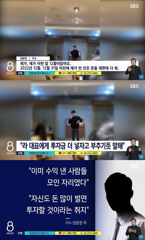 SBS에서 공개한 영상 속 임창정은 "이번 달이 12월이다. 12월 31일 이전에 번 모든 돈을 쟤(라덕연)한테 다 준다"라고 말했다.