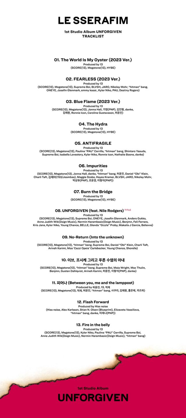 이 밖에도 새 앨범에는 'Burn the Bridge', 'No-Return (Into the unknown)', '이브, 프시케 그리고 푸른 수염의 아내', '피어나 (Between you, me and the lamppost)', 'Flash Forward', 'Fire in the belly' 등 총 13곡이 수록된다. 앞서 발매된 미니 앨범 'FEARLESS'와 'ANTIFRAGILE'(안티프래자일)에 수록된 6곡도 포함돼 세 개의 앨범을 아우르는 '르세라핌만의 이야기'가 완성됐다.