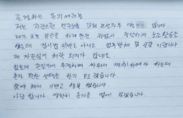 강원건설지부 지대장인 양아무개씨는 "제가 오늘 분신을 하게된 건 죄없이 정당하게 노조활동을 했는데 집시법 위반도 아니고 '업무방해 및 공갈'이라니 자존심이 허락되지가 않는다"며 "영원히 동지들 옆에 있겠다"는 내용의 유서를 남겼다고 전했다.