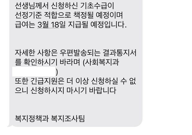 글쓴이가 구청으로부터 받은 기초생활수급 대상자 문자 메시지. / 에펨코리아
